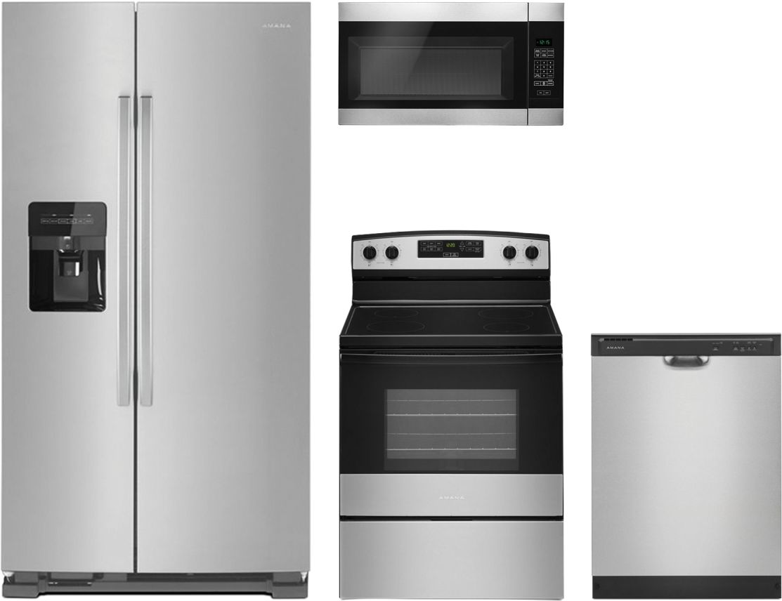 Amana® 4 Piece Stainless Steel Kitchen Package with a Side-By-Side Refrigerator, Built In Dishwasher, Freestanding Electric Range, and Over The Range MicrowaveRead More